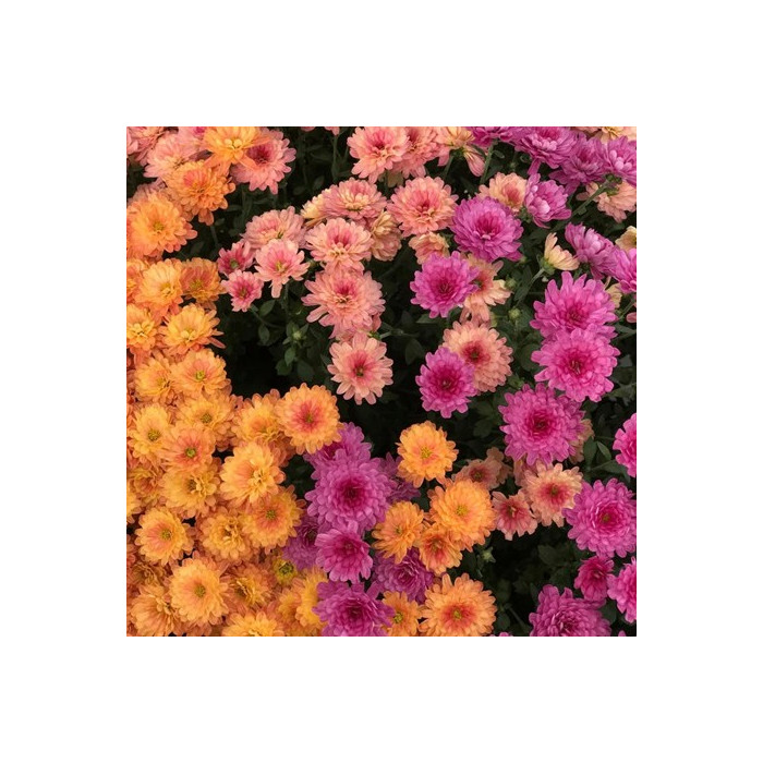 A lush colorful combination of three top-of-the-line mum varieties. Place in area of full sun. water well and fertilize regularly for best results.